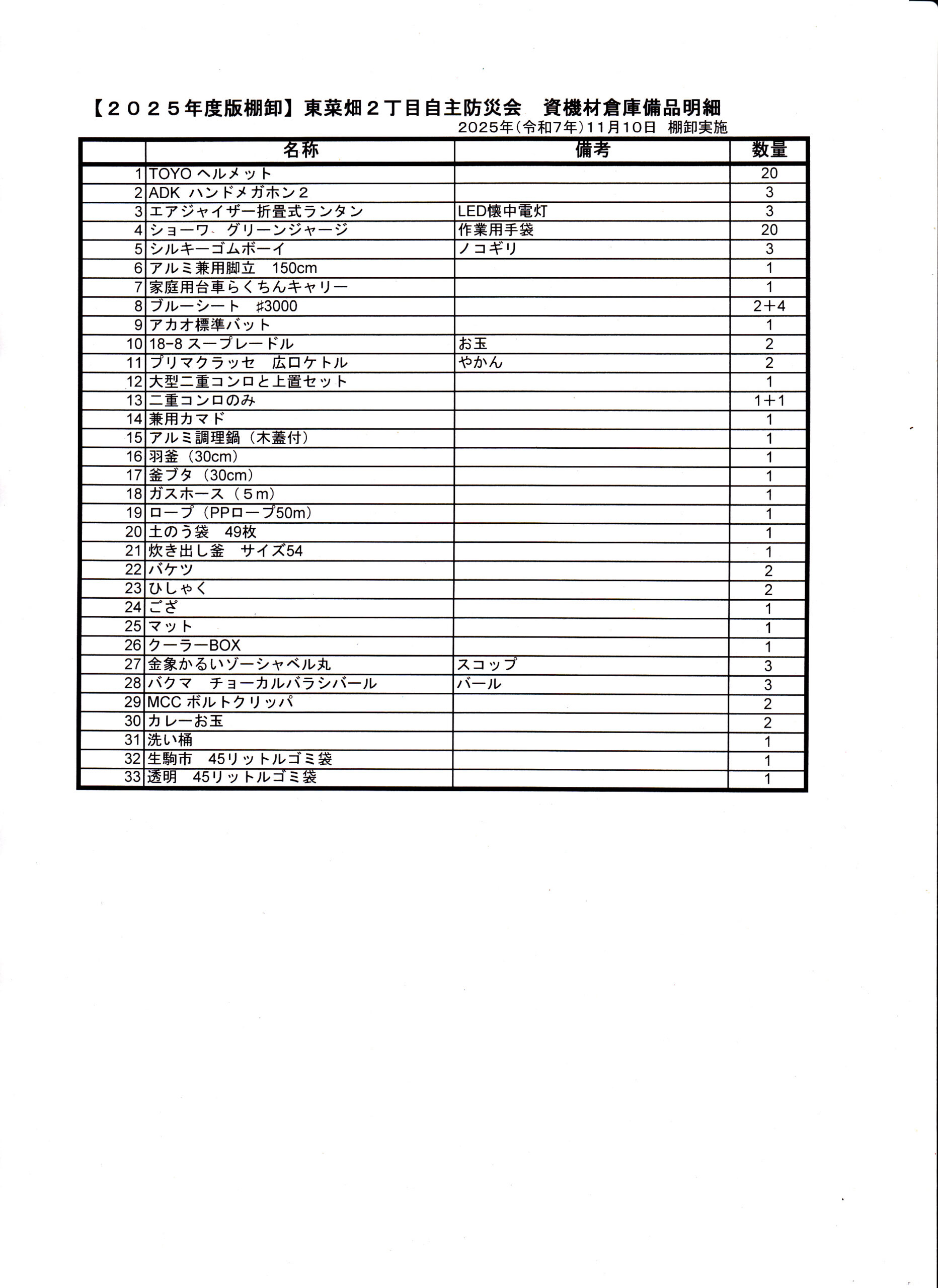 【2026.01.25】防災倉庫欠品資機材購入情報 2026年1月25日 最終更新日時 : 2026年1月25日 mr2rflismo 2025.11実施した棚卸にて、欠品が判明しています。 追加購入分、2026.1.18自治会役員会で購入配備了承頂いて いますので発注します。 01_棚卸結果シートダウンロード 02_欠品リストダウンロード 03_01見積書1ダウンロード 03_02見積書2ダウンロード 03_03見積書3ダウンロード 03_04見積書4ダウンロード 03_05見積書5ダウンロード 03_06見積書6ダウンロード 03_07見積書7ダウンロード \ 最新情報をチェック / FacebookXBlueskyHatenaCopy